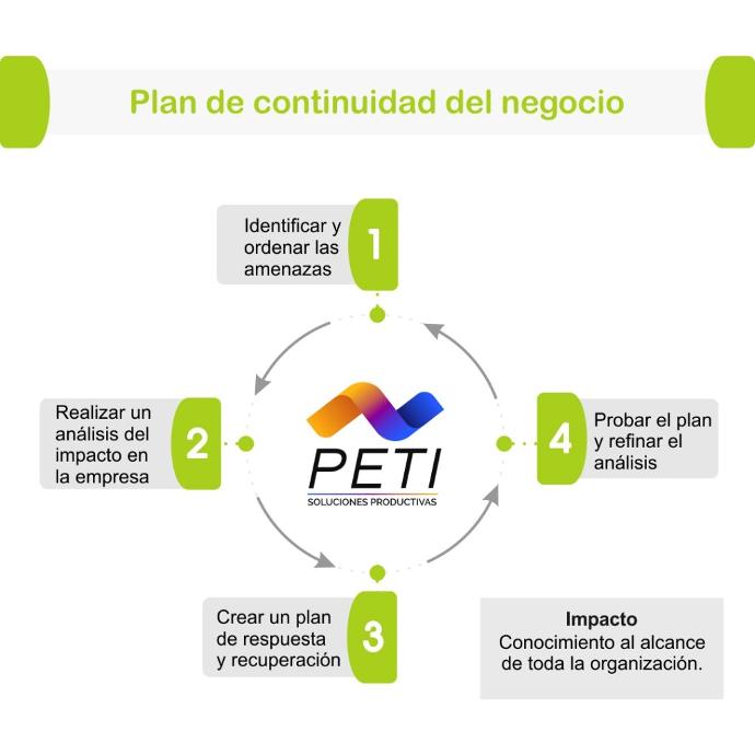 En Peti soluciones Productivas, con base en la NTC 5722 (ISO22301:2012) le ayudamos a construir su Plan de continuidad de negocio ante posibles eventos catastróficos o severos que amenacen su operación.